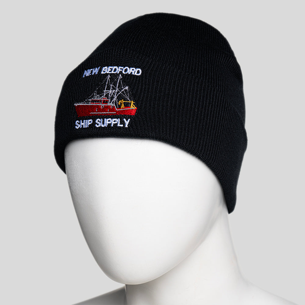 When winter gales sweep across the harbor, this is the beanie that keeps our fleet warm. Featuring our heritage embroidered NBSS ship logo in bold white and red, this heavy-duty skull cap delivers the same reliable warmth that New Bedford's fishermen count on during the coldest months at sea. The iconic colorway stands out against the black knit – a familiar sight on the working waterfront that's been keeping heads warm through brutal North Atlantic winters for generations.